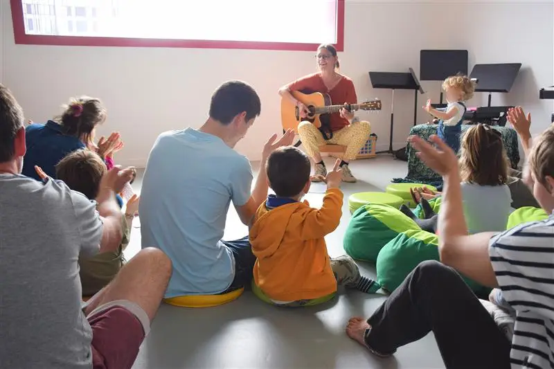 Guidés par un ou une musicien.ne, les plus petits (moins de 5 ans) et les plus grands (parents , grands – parents…) sont invités à chanter ensemble : comptines, chansons à gestes, jeux de doigts…