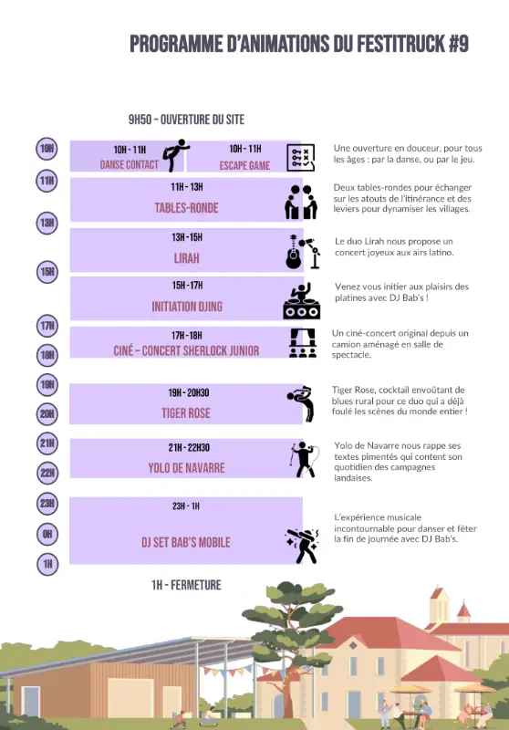 Il y aura évidemment des camions alimentaires pour la « hartayre et pintayre », mais pas que : optique, coiffure, tatouage, jeux d’arcade, cinéma, culture, fablab, DJ, prévention, déchets… ET : Escape Game, Danse Contact, tables rondes, animations et ateliers. concerts, spectacles, DJs… jusqu’à 1h du matin. Entrée libre !